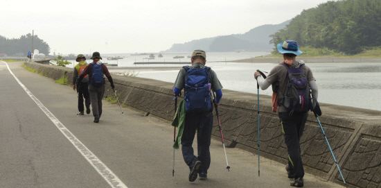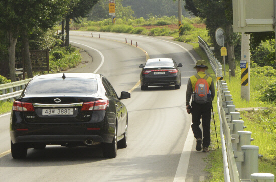 충만한교회에서 바래길 약 300m구간은 도로를 타고 가야 하는데 갓길이 50㎝남짓해 너무 좁아 통행이 자유롭지 않아 위험하다. 동행한 문부경 대장은 남해군이 이 구간에 대해 해안가 마을 쪽으로 우회해 정비사업을 진행 중이라고 했다.