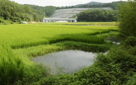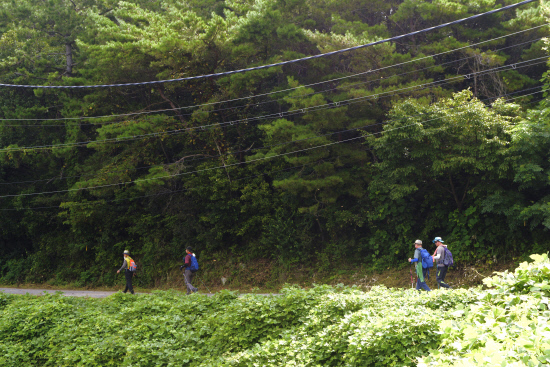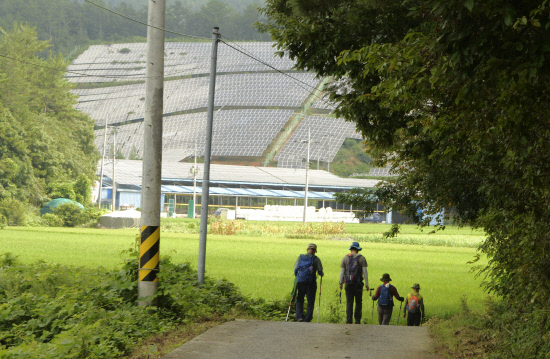 해안가를 따라가다 산으로 올라간다. 이때부터 바래길은 장포항까지 약 4㎞까지 산길이다. 둠벙이 발달한 벼논 들녘 너머 산 사면에 나무들 대신 태양광패널이 들어차 있다. 친환경 전기를 생산하기 위해 산의 상당부분 수목을 베어내고 태양광패널을 설치한 것이 환경을 보호하는 것인지, 자연을 훼손하는 일인지는 아직 논란이 많다. 다만 나무를 자르고 민둥산을 만든 뒤 구조물을 설치한 것은 미관상 좋게 보이지는 않는다.