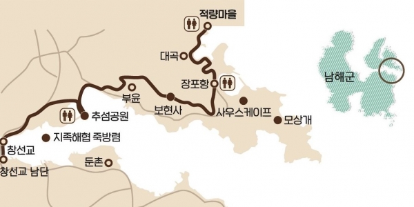이 코스에서는 만곡진 바다, 원형의 장포항을 따라 걷는 여유가 느껴지고 고즈넉한 추섬공원의 산책이 낭만적이다. 추섬은 과거 섬이었으나 방파제로 연결되면서 육지화 돼버렸다. 남파랑길과 바래길을 걷는 사람들이 오갈뿐이지만 지역에서는 나름대로 공원을 조성하고 산책로를 정비해 한번쯤 들러볼만한 곳이다.