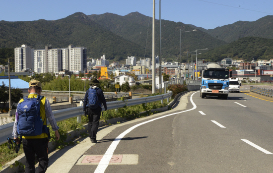 ▲이동면행정복지센터 앞에서 출발한다. 무심코 이동초등학교 쪽으로 조금 더 진행했더니 ‘바래길 앱’이 경로이탈 경고음을 울렸다. 되돌아와 남해고등학교 부근에서 바다쪽으로 꺾어 터널을 통과한 뒤 곧장 해안 길에 올라선다.