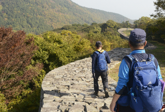 대국산성 오르는 숲길, 터널을 이룬 갈참나무에 노랗고 빠알간 단풍이 들었다. 길 위에는 햇빛에 비썩 말라버린 갈빛의 나뭇이 소슬바람에 뒹군다. 가을과 함께 찾아온 단풍, 낙엽은 늙어서 지고 가을은 한층 깊어져 겨울곁으로 다가간다. 낙엽이 밟히는 소리가 좋다. 가을 느낌이 들어 참 좋다. 멀리 다가오는 성벽 위로 아지랭이가 피고 가슴이 울렁거렸다.